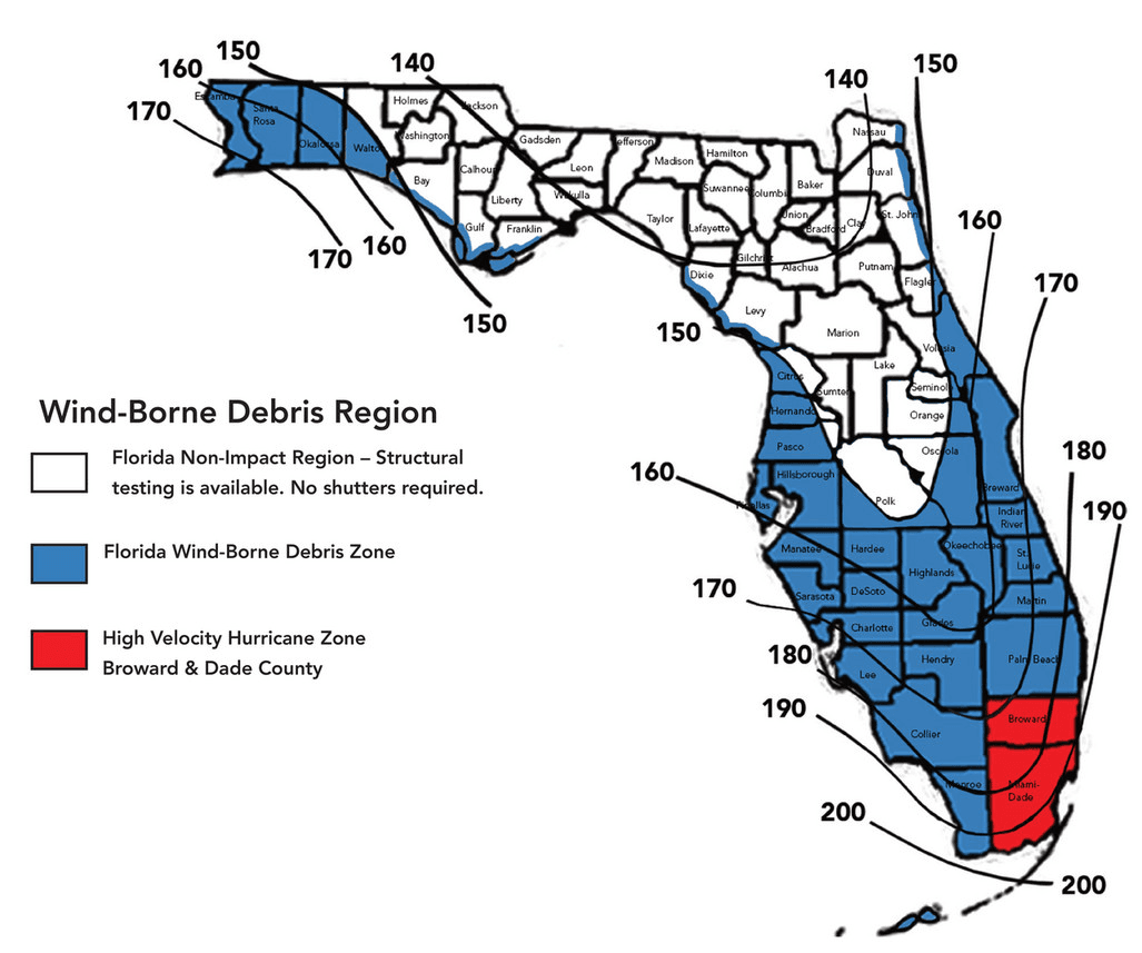 Blue areas mark the Florida Wind-Borne Debris Zone (WBDR).