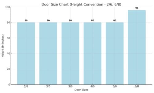 Professionals often use shorthand when discussing door sizes. For example, a door measuring 30 inches wide by 80 inches tall may be called a “2/6, 6/8 door,” where the first number refers to width and the second to height in feet and inches.